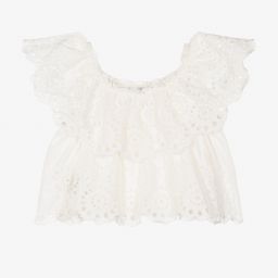 Girls yellow blouse by Mayoral, made in soft cotton broderie anglaise. It has a cropped fit and the neck is elasticated and trimmed with a beautiful ruffle. The blouse is lined in soft cotton jersey for comfort.