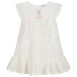Girls yellow chiffon broderie anglaise dress by Mayoral. Soft and lightweight, it has a ruffled hem with embroidered pom-pom trim, ruffles on the bodice and a plaited tassel with silver metal beads. The dress has a lightweight cotton lining and fastens with a single button on the back.