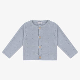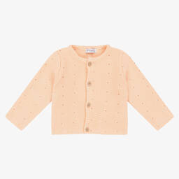 Dusky pink cardigan for baby girls, by Mebi. Knitted in soft and lightweight cotton, it has a sweet cut-out dotted design and wooden-style buttons on the front.