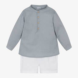 The boys blue and beige outfit set by Mebi is crafted with care, featuring a charming fair isle patterned sweater made from a soft blend of acrylic, wool, viscose, and alpaca. The sweater includes ribbed trims and button fastenings for easy dressing. Complementing the top, the corduroy shorts offer a comfortable fit with their stretchy waist and soft cotton voile lining. Limited quantities available, making it a great choice for autumn and winter wardrobe essentials.
