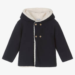 A grey knitted jacket for little boys by classically styled brand Mebi. Fastening with wood-effect buttons, this hooded jacket has a sherpa fleece lining to keep them cosy and warm. Mebi is a very small fitting brand, please choose a size up to allow room to grow.