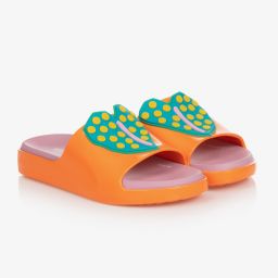 Boys and girls turquoise blue jelly Fábula sliders by Mini Melissa, with an orange snake on the foot strap. They are made in sweet-scented Melflex®, a recyclable PVC that is both flexible and comfortable. The lime green inner soles are moulded for a comfortable fit.