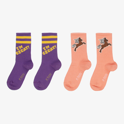 Pack of two pairs of socks for boys and girls by Mini Rodini, made in soft organic ribbed cotton. The yellow pair has a brown horse on each side and the ivory pair has green stripes around the top, with the words 'I'm Great!'