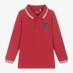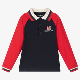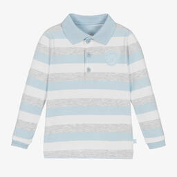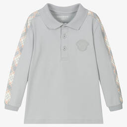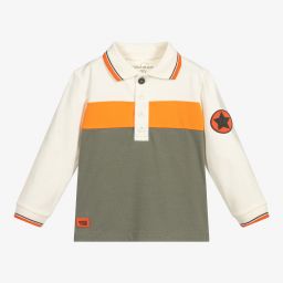 Light grey colourblock polo shirt for little boys by British designer Mitch & Son, made in soft, breathable cotton jersey. It has yellow and green sleeves with white trims and a rubberised logo on the front. Neatly finished with button fastenings for comfort and easy dressing.