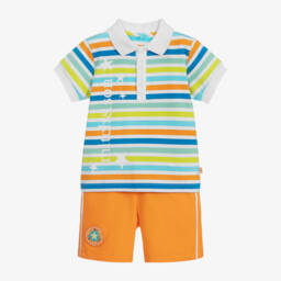 Cute white and blue shorts set for boys, by Mitch & Son. Made in soft cotton jersey, the polo shirt has a rubberised logo print on the chest, with blue raglan-style sleeves and a logo tape trim on the sleeves. It pairs with matching blue logo tape shorts, with a rubberised logo on one leg, and an adjustable drawstring waist for comfort.
