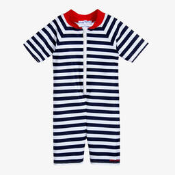 Exclusive to Childrensalon, a red and white striped sun suit by Mitty James for boys and girls. Made in silky, stretchy jersey with UPF 50+, it has a navy blue trim around the collar, an exposed front zip and the brand's embroidered logo on one leg in navy blue.