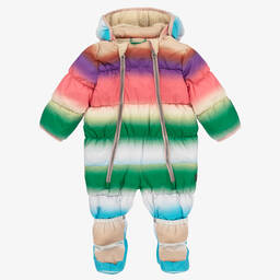 Green snowsuit for baby boys by Danish brand Molo. Made in recycled material with waterproof coating, the fleecy inside and fold-over mittens help keep warmth in. The lined hood and booties are easily detached via poppers for an alternative finish. Two front zip fastenings make dressing and changes fuss-free.