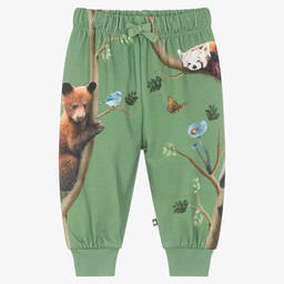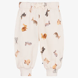 Beige organic cotton joggers for little boys and girls by Danish brand Molo. Made in soft and stretchy jersey, they have a fun mushroom print in shades of blue, green and orange. These comfortable joggers have ribbed cuffs and an elasticated drawstring waist for a good fit. For a subtle designer finish, there is a logo tab on one side seam.