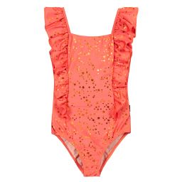 A black and gold swimsuit for girls by Molo, with a UPF factor of 50+. The soft and stretchy lycra fabric has a gold shimmery print, with ruffle trims, deep scooped back and a strap with clip fastening.