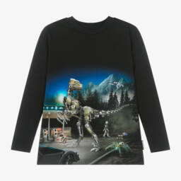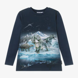 The boys blue dinosaur long sleeve top by Molo is crafted from organic cotton, featuring a captivating prehistoric print. Made from soft jersey, it offers comfort and ease for everyday adventures. This top is suitable for young dinosaur enthusiasts and offers a relaxed fit, ideal for layering during cooler seasons. Limited quantities available, don't miss the chance to add this unique piece to the wardrobe.