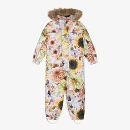 A green snowsuit for boys by Molo, made with a waterproof and windproof exterior. This technical all-in-one is patterned in graphic dinosaurs with reflective trims for an eye-catching look on the slopes. It has an insulative padding, concealed flap-over pockets and a removable velcro hood with a detachable faux fur trim. Lined in polar fleece and silky fabric, there are internal elasticated shoulder straps and stirrups that attach to the ankles with buttons. It fastens with a zip and gold popper placket.