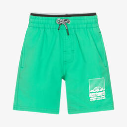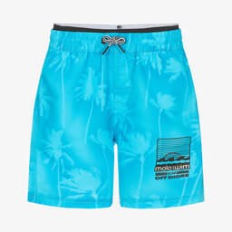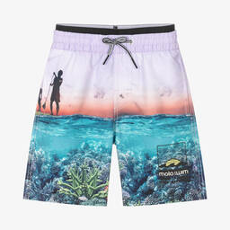 Cool green and orange gradient effect swim shorts for boys from Molo, with UPF 50+. Silky smooth and lined with soft mesh for added comfort, they have an internal elasticated waistband with an adjustable drawstring fastening for a secure fit. With discreet pockets on the side seams, they are printed with smiling black palm tree graphic along with a black surf-themed logo on one leg for an eye-catching finish.