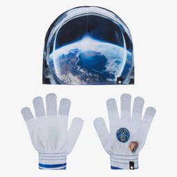 Green hat and gloves set for boys by Molo, made in a super soft polyester jersey. Great for co-ordination, both pieces are matching, with a fun dinosaur print.