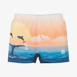 Boys palm print blue swim shorts by Molo offer a playful touch with their ombré design featuring spray-painted smiles and palm trees. Crafted from silky soft, recycled materials, they provide comfort and protection with a UPF factor of 50+. A logo on one leg adds a stylish finish. Suitable for sunny days at the beach or pool, these shorts are a wardrobe essential. Limited quantities available.