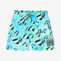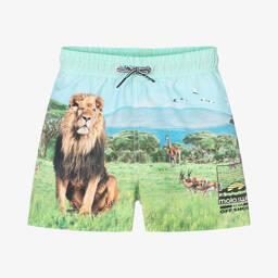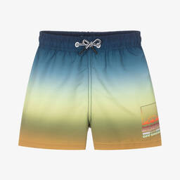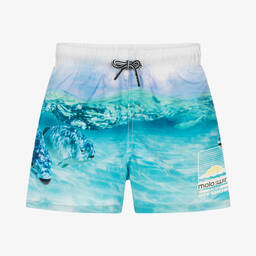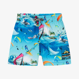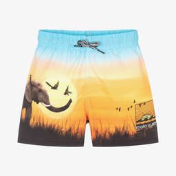 Turquoise blue and orange swim shorts for boys from Danish brand Molo, with UPF 50+. Silky smooth they are lined with soft mesh for added comfort, and the elasticated waist can be adjusted via drawstring for a better and more secure fit. To stand out from the crowd, they are printed with a parachuters graphic and a sunset sky scene along with a black surf-themed logo on the leg.