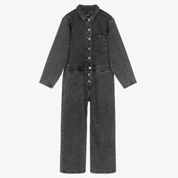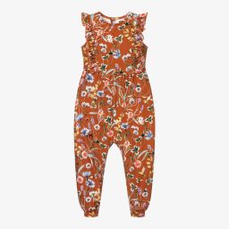 Little girls jersey jumpsuit by Molo, made in soft and lightweight viscose. It has a colourful green and blue floral print and pretty frills on the shoulders. It fastens with mother-of-pearl buttons on the back and poppers between the legs. The waistband is gently elasticated on the sides for comfortable wear.
