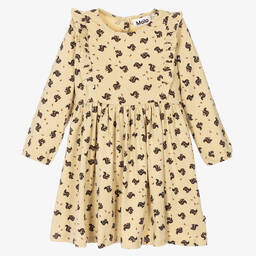 Little girls terracotta pink organic cotton dress from Danish brand Molo. Made in stretchy, comfortable jersey, it is patterned with lovely, small orange and burgundy red flowers. This dress has feminine frills running over the shoulders, long sleeves with elasticated cuffs and popper fastenings on the back for easy dressing.