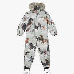 Boys technical snowsuit by Molo, with an all-over green pre-historic dino forest print. Soft, smooth and durable, the shell, lining and padding are made with recycled polyester. With medium-weight 3M™ Thinsulate™ insulation, this breathable snowsuit has an eco-friendly, waterproof coating and taped seams to keep your little one warm and dry. It features handy front pockets, removable rubber stirrups and internal braces. It has a removable hood with a detachable faux fur trim, soft polar fleece lining, and light reflective details for added safety. There is popper flap over the front zip fastening for protection from the elements.