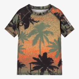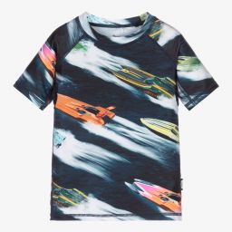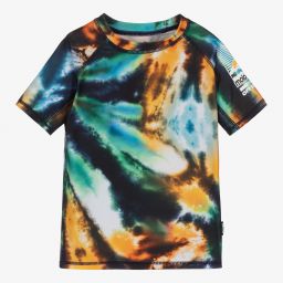 Blue and orange short-sleeved sun protective top for boys, by Molo. Made from Repreve® recycled polyester, it has a tie dye print. Can also be worn when swimming.
