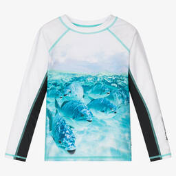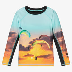 Sun protective top for teen boys by Molo, with a safari scene background and a lion graphic print on the front. With a sun protective value of UPF 50+, this functional long sleeve top is made with recycled materials.