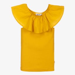 Teen girls pink top for teen girls, by Molo. Made from soft and stretchy organic cotton, it has a stylish ruffle on the elasticated neckline.