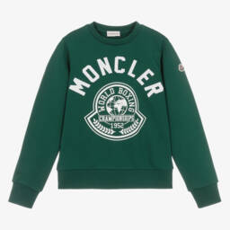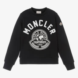 From luxury designer Moncler Enfant, a navy blue sweatshirt for teen boys. Inspired by the World Boxing Championships, it features a bold white varsity-style logo on the front, with the designer's iconic felted logo badge on one sleeve. This casual wardrobe staple is made in comfortable cotton jersey with a cosy fleece feel inside.