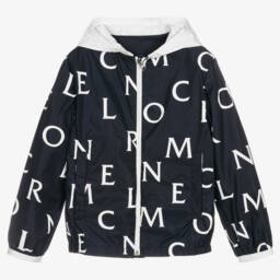 Teen boys navy blue zip-up windbreaker jacket by luxury brand Moncler Enfant. Smooth and lightweight, it has a white logo-letter pattern and a white silicone logo patch on one sleeve. The ivory hood is lined for comfort and has soft elasticated trim to match the sleeve cuffs. There are popper fastening pockets on the front.