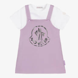 Cute coral orange and white dress set for little girls by luxury French brand Moncler Enfant, made in soft and stretchy cotton jersey. The coral orange pinafore style dress has a large silver rubberised logo on the front and popper fastening shoulder straps for easy dressing. The white T-shirt has the brand's signature rubber logo patch on one sleeve and useful popper fastenings on one shoulder.