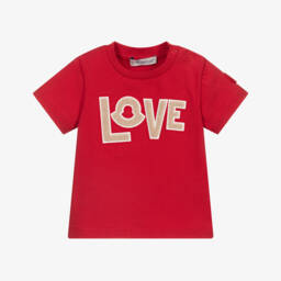 Little girls red cotton T-shirt by Moncler Enfant. There is a beige 'LOVE' appliqué on the front and popper fastenings on one shoulder, with a logo badge on one sleeve.
