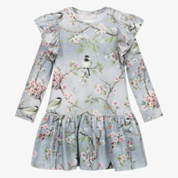 Light grey dress for girls by Monnalisa. Made with soft and stretchy cotton jersey, it has pretty frills on the shoulders, a ruffled hem, and a small rose gold heart logo. It is printed with a charming pink, pale blue, and green cherry blossom flower and bird design.