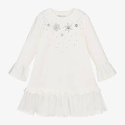 The girls navy blue cotton snowflake dress by Monnalisa combines elegance with comfort. Crafted from soft and stretchy cotton jersey, it features a fleecy interior for added warmth. The dress features shimmering silver beaded snowflakes on the bodice, complemented by a ribbed neckline and fluted cuffs. A tulle hem with cotton voile lining adds a touch of sophistication. Suitable for special occasions, limited quantities available, so secure yours today.