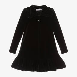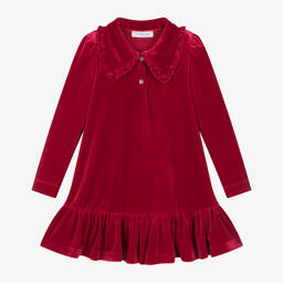 Gorgeous red velour dress for girls, by Italian luxury brand Monnalisa. It has glam, silver jewelled buttons on the front and an oversized ruffle collar. The sleeves are gently elasticated and it has a relaxed dropped waist for a chic, understated style.