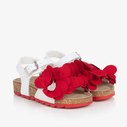Girls white and navy sandals by Monnalisa, featuring faux leather with glittery straps and a ruffled navy flower decoration with a silver heart charm for a sweet branded look. They have adjustable buckles for a secure fit, a soft felt lining, and a contoured suede insole for comfort. The ridged rubber outsole is non-slip for added grip. Limited quantities available, so don't miss the last chance to buy this stylish footwear.