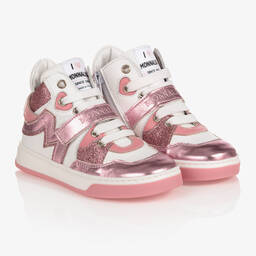 White, silver and pink high-top trainers for girls by Monnalisa. Made in durable leather, they can be laced up and secured with a velcro strap across the foot and there is a side zip for easier dressing. They are lined with soft leather and slightly padded on the heel for improved support. The glitter, silver and pink panelling with logos make them stand out in a crowd.