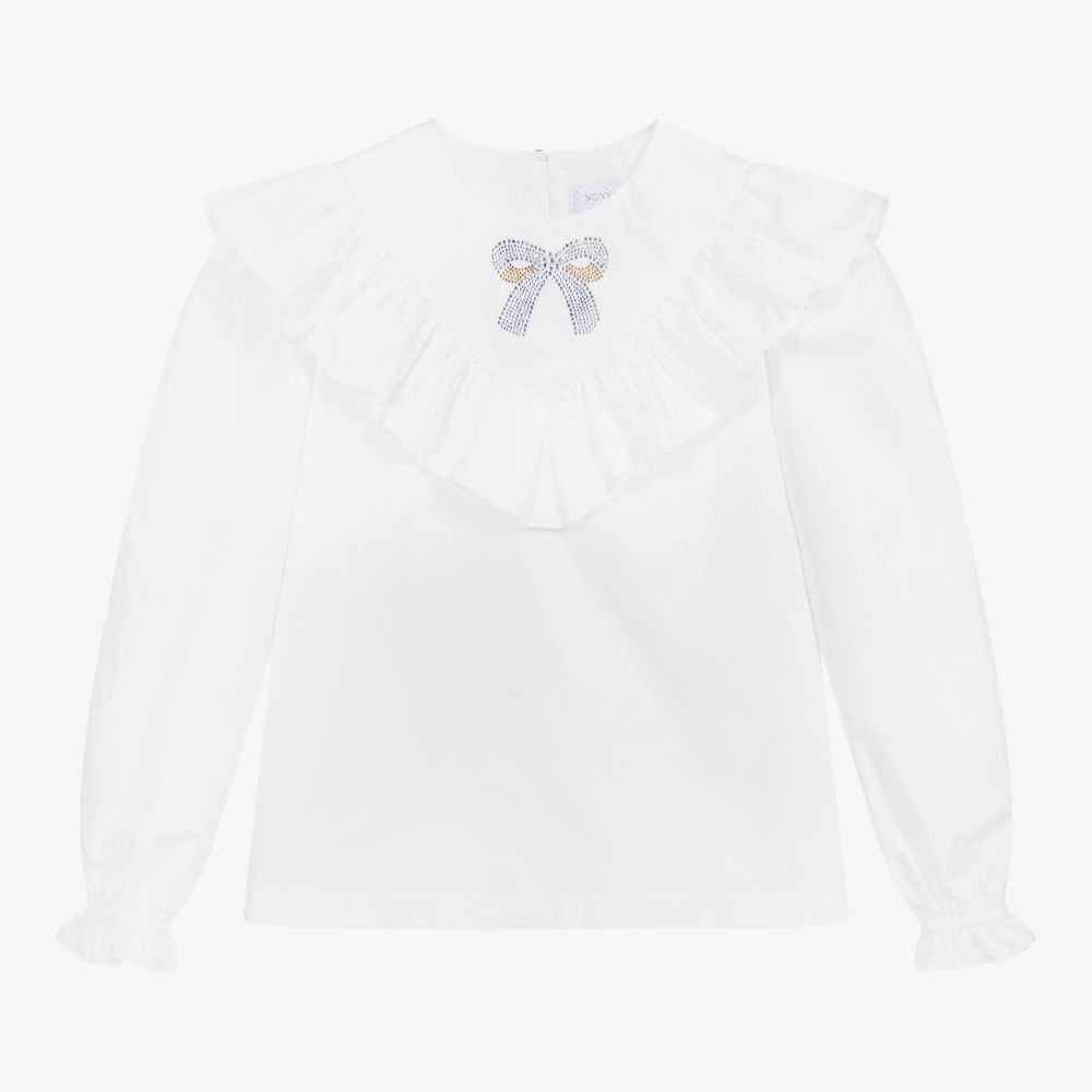 Lovely ivory blouse for teen girls by Monnalisa, with just the right amount of sparkle. Made in beautifully lightweight cotton, it has a silver and gold diamanté bow on the bodice, with ruffles over the shoulders. It has gently elasticated, frilled cuffs and a crystal button fastening on the back.