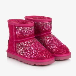 Encrusted with pink and silver diamanté, these bright pink suede leather boots for teen girls are by Monnalisa. Sure to keep feet warm and toasty, they are lined in the softest faux fur, with non-slip rubber soles for a good grip. For designer recognition, there are brown and gold diamanté logo patches on the heels.