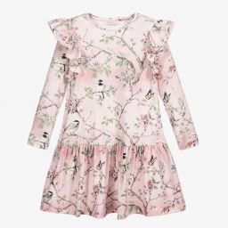 Teen girls blue grey jersey dress from Monnalisa, with a colourful floral and bird pattern. This dropped-waisted style has ruffles over the shoulders and a gathered skirt.