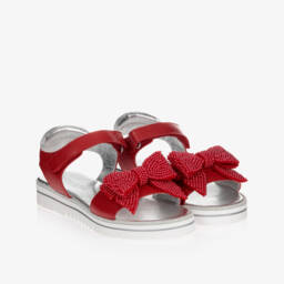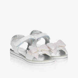 Teen girls white leather sandals by Monnalisa, with a rubber logo patch on the back. These sandals combine comfort, such as the adjustable strap and ridged outer soles, with glam details such as beautiful beaded bows and metallic silver trim. They have velcro fastening and silver padded leather inner soles.