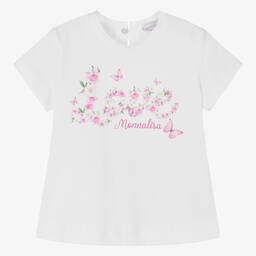 A white T-shirt for girls by Monnalisa, made from soft, stretchy cotton jersey with soft ruffle sleeves. This pretty little top has a lovely Disney 'The Little Mermaid' graphic on the front with sparkly blue 'Under the Sea' logo.