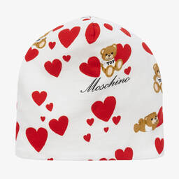 Pink hat for baby girls by Moschino Baby, with a signature Moschino Teddy Bear appliqué on the front. It is made in soft velour and lined in pink striped cotton jersey. There are cute little ears on top, with useful flaps to keep little ears warm.