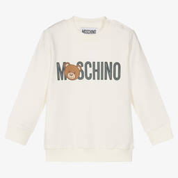 Cute black cotton sweatshirt for baby boys and girls by Moschino Baby. Soft and lightweight, it has the iconic Moschino Teddy Bear logo print on the front. There are popper fastenings on one shoulder for easy dressing and the sweatshirt is finished with classic ribbed trims.