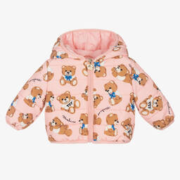 Ivory puffer jacket for little boys and girls by Moschino Baby. Smooth and silky, it has a cute all-over Moschino Teddy Bear logo pattern and a gold branded zip fastening on the front. Lined in soft cotton jersey for comfort, it has elasticated trims and is lightly padded to keep in the warmth.