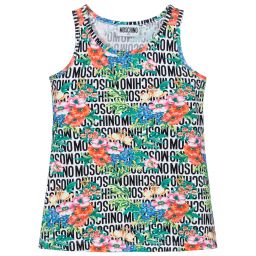 Girls pretty cotton sleeveless top by Moschino Kid-Teen, with a pink floral logo print on a white background. Made from soft and stretchy jersey, this casual top is ideal for warmer months.