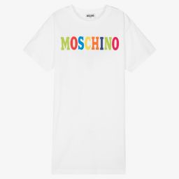 Casual black T-shirt dress for teen girls by luxury Italian designer Moschino Kid-Teen, made in comfortable cotton jersey. As seen in the main collection, it has a colourful flocked logo on the front.