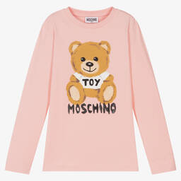 Black cotton top for teens from luxury Italian brand, Moschino Kid-Teen. This soft, stretchy jersey top has a fun Moschino Teddy Bear logo print, with a comfortable crew neck and long sleeves for extra warmth.