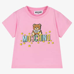 Wonderful yellow T-shirt for little boys and girls by Italian brand Moschino Baby, made in the softest organic cotton jersey. It has the brand's signature Teddy Bear graphic, with a colourful logo and stars printed on the front. There are useful popper fastenings on one shoulder.