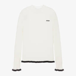 Girls ribbed pink rollneck jumper by MSGM features a soft viscose blend with a chic intarsia logo on the front. This knitwear piece has black fluted trims on the sleeves and hem, offering a stylish contrast. Suitable for keeping warm during cooler months, it's designed for easy wear and comfort. Limited quantities available, so don't miss out on this elegant addition to any wardrobe.