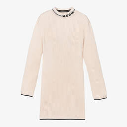 Fuchsia pink ribbed dress for teen girls by Italian designer MSGM. Made in a super soft viscose-blend knit, it has a turtle-style neckline with a jacquard MSGM logo and ivory trims. Warm, comfortable and easy to wear, it simply pulls on over the head.