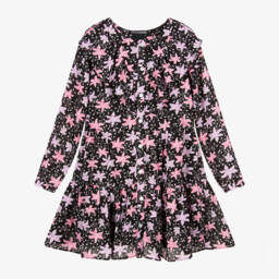 Girls grey and black tie-dye dress from NIK&NIK, made in recycled polyester chiffon. This beautiful shirt dress has front button fastening and chest pockets. Lined in super-soft viscose, it has a ruched skirt and a ruffle on the hem.