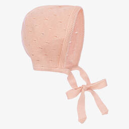 Lovely dusky purple bonnet for baby girls, designed by Paloma de la O. Knitted in a soft cotton blend, it has sweet pointelle detailing and garter stitch details around the trim for a charming finish. It ties easily underneath the chin for a secure fit.